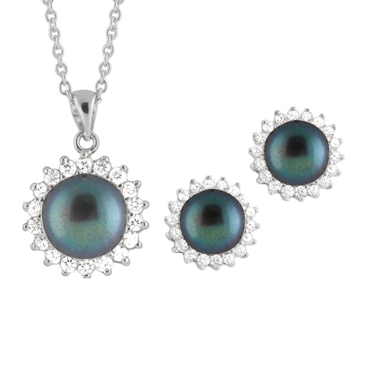 Fancy sterling silver rhodium plated pendant and 17" chain with 8½-9mm white or black freshwater pearls and cubic zirconia and matching earrings.