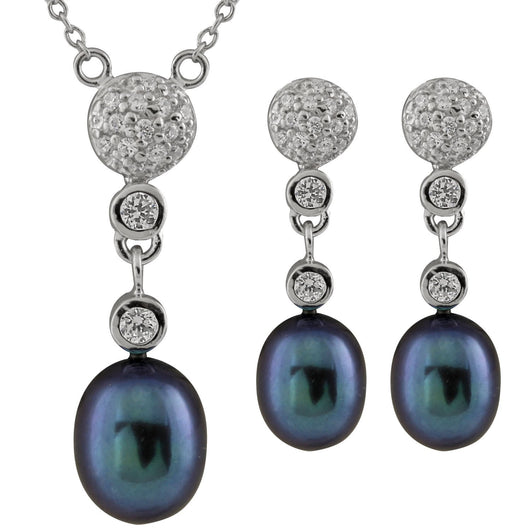 Fancy sterling silver necklace and earrings with cubic zirconia and white freshwater pearls.