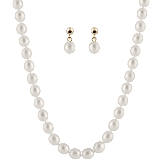 7-7½mm Rice Shaped Freshwater Pearl Necklace and Ball Earrings set in 14K Gold. Available in white and purple.
