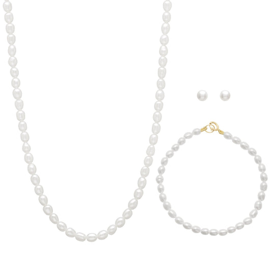 3-4mm Rice Shaped Freshwater Pearl 14" Necklace, 5" Bracelet, and Earrings set in 10K Gold.